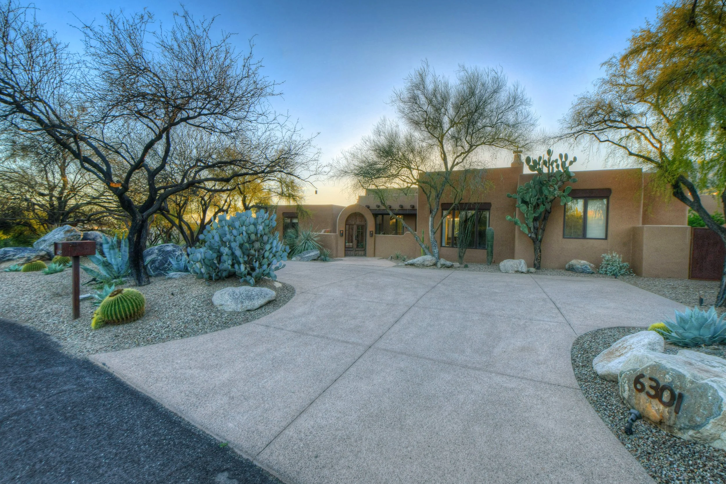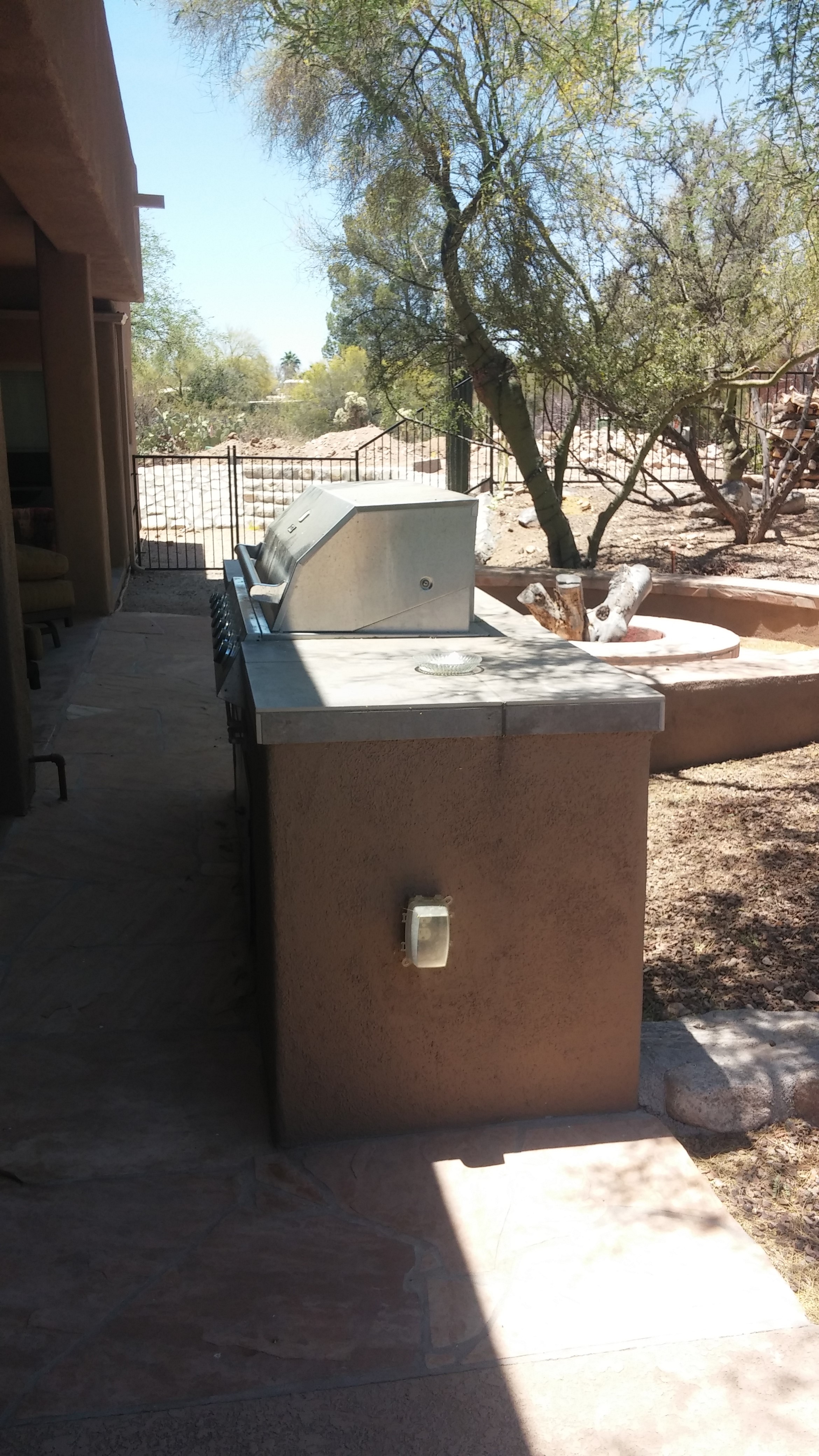 Its a fun challenge to have to work with existing structures and make it all flow nicely. This project really embodies this. The home was original and the clients wanted to add a large "Casita" for family and guests. The pool was sited in this new courtyard space. This allows for a harmony to take place between the home and "Casita". We provided adequate hardscape pavers and balanced it with synthetic grass, which acts as both hard and softscape. We added a dominant entry gate and portal to establish scale, importance, and a touch of Tucson rustic! Never forgetting those step details, We source tiles to complement . Once you enter, we knew we need to create another WOW moment. We accomplished this with a large tiled fountain wall, which not just looks impressive but fills the space with the sounds of running water. We finished it off with a few plants ,for now, with more to come.