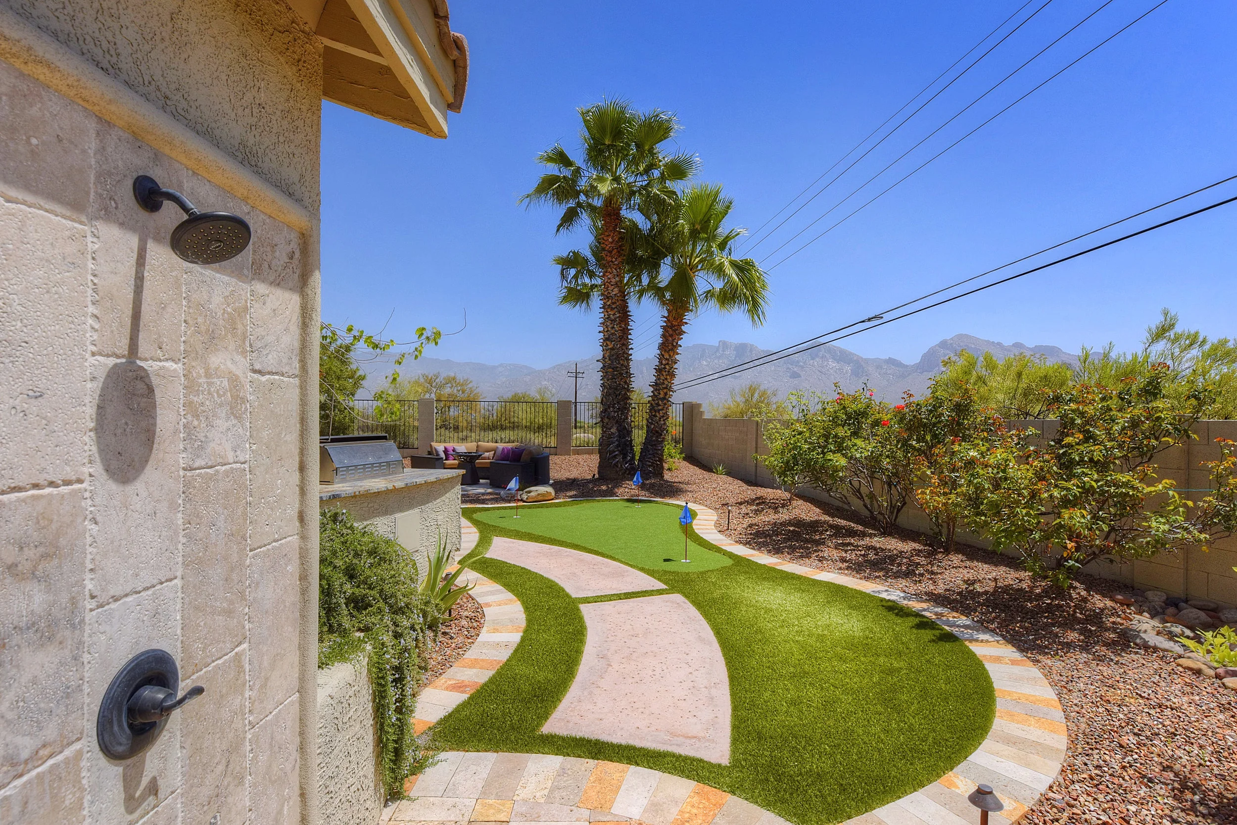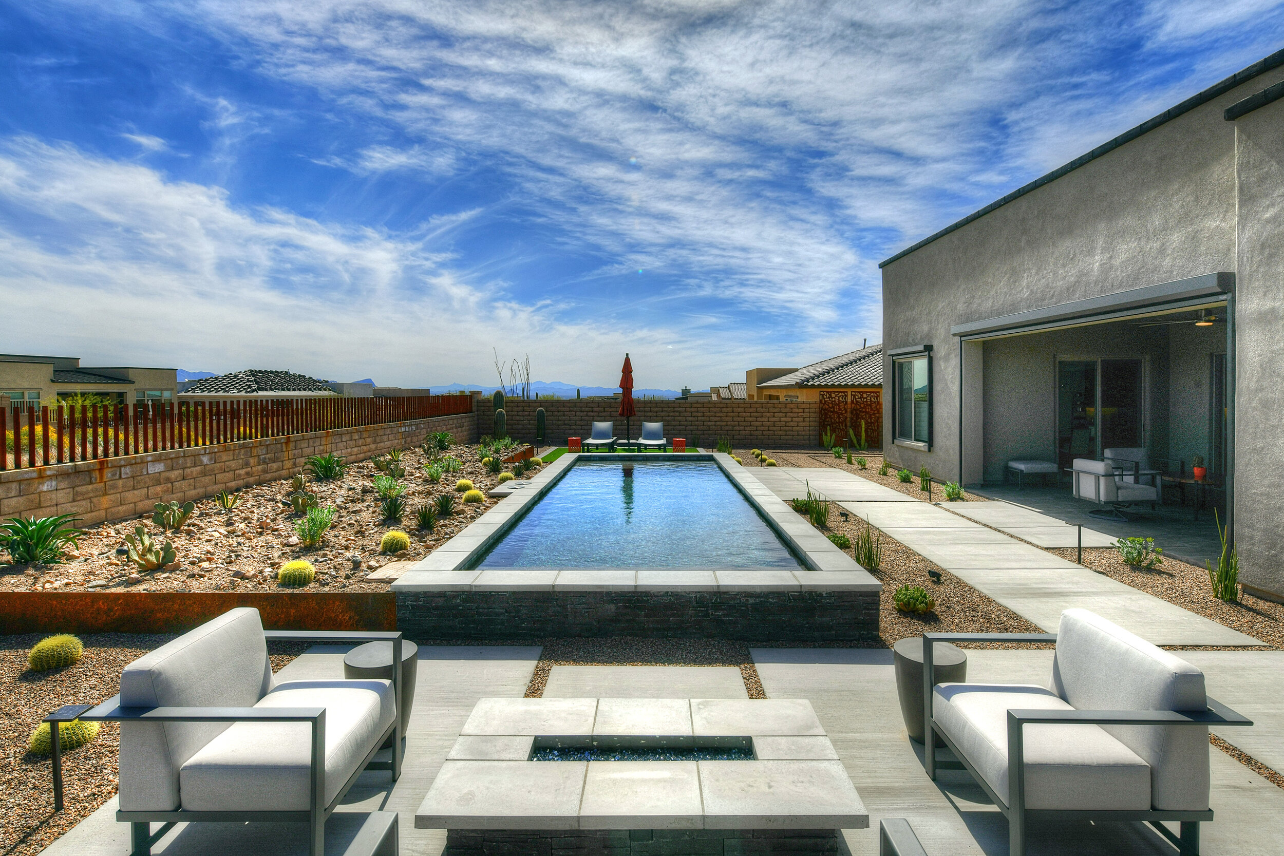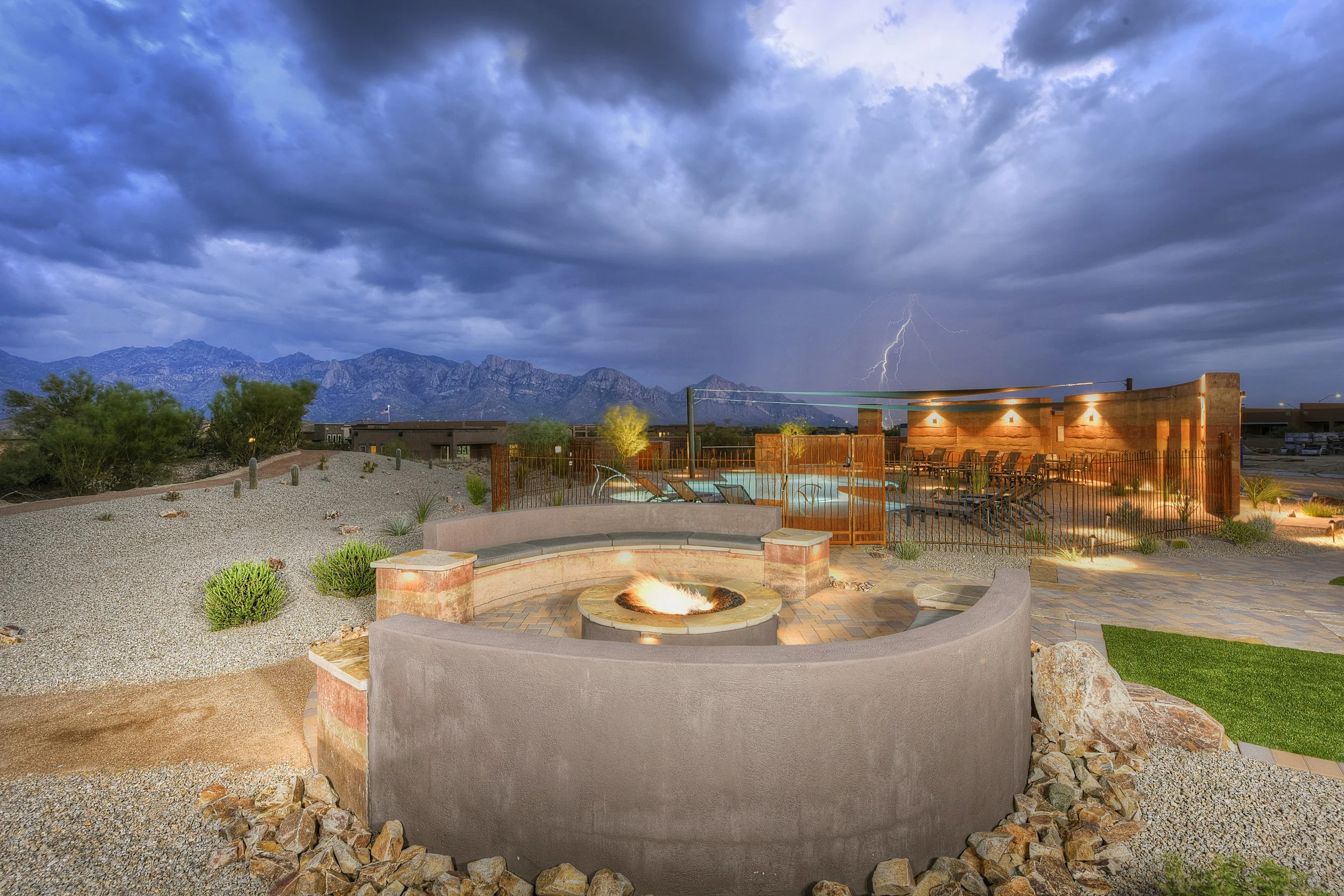 This design process started with a site overlooking the large golf course pond, as well as the Tortolita mountain range. The pool and spa were designed in a low sleek manor with a negative edge to accentuate the raised home pad and bring the colors of the southwest back into the yard. The lagoon shelf houses two ledge loungers for in-water sun bathers. We designed the hardscaping using larger format travertine and fossil creek flagstone. The stone fire pit with ceramic logs adds a perfect area to retire at the end of the evening and enjoy the west sunset views. Synthetic grass was integrated into the space for the client's pets and grandkids to enjoy, adding a visually cooling effect to the backyard. With the planting design, we wanted to transition smoothly from the natural desert and enhance and supplement with a variety of flowering shrubs and groundcovers. A custom horseshoe pit was implemented on the expansive side yard as well as a large 1200 gal water harvesting cistern. The low voltage lighting was integrated throughout to showcase not only the homes features but the beautiful sculptural plantings and large saguaros that were brought in after a salvage.